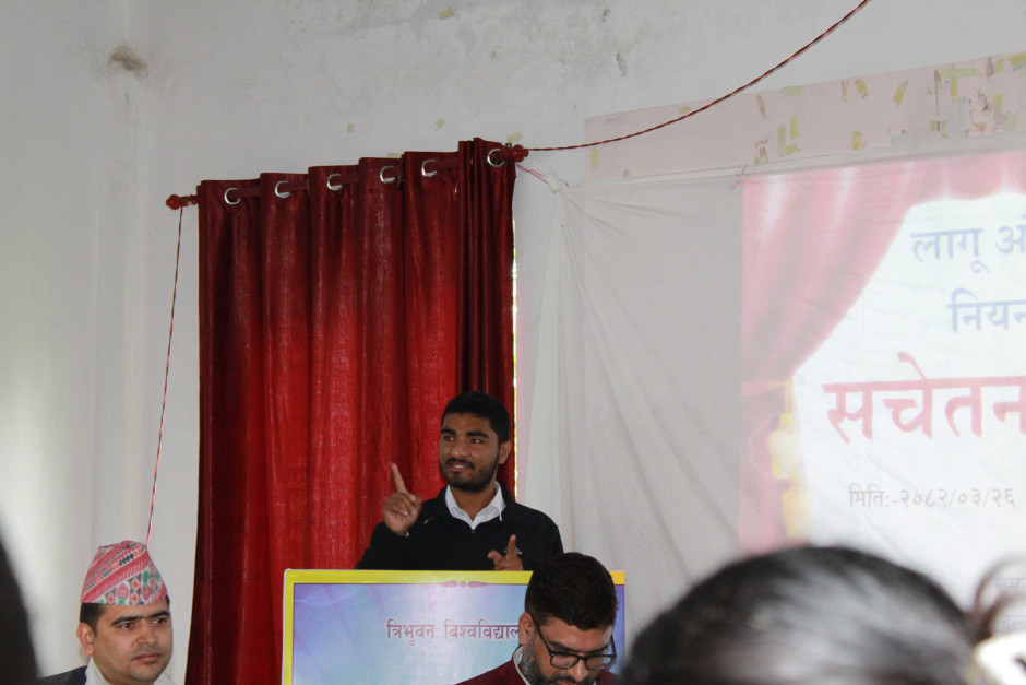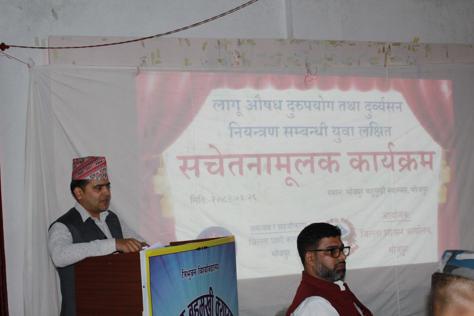 मिति २०८२।०३।२६ गते जिल्ला प्रशासन कार्यालय, भोजपुरको आयोजना, जिल्ला प्रहरी कार्यालय, भोजपुरको समन्वय तथा सहजीकरण एवम् श्रीमान् प्रमुख जिल्ला अधिकारी श्री सुरेश पन्थीज्यूको अध्यक्षतामा लागू औषध दुरुपयोग तथा दुर्व्यसन नियन्त्रण सम्बन्धी युवा लक्षित समेतना
