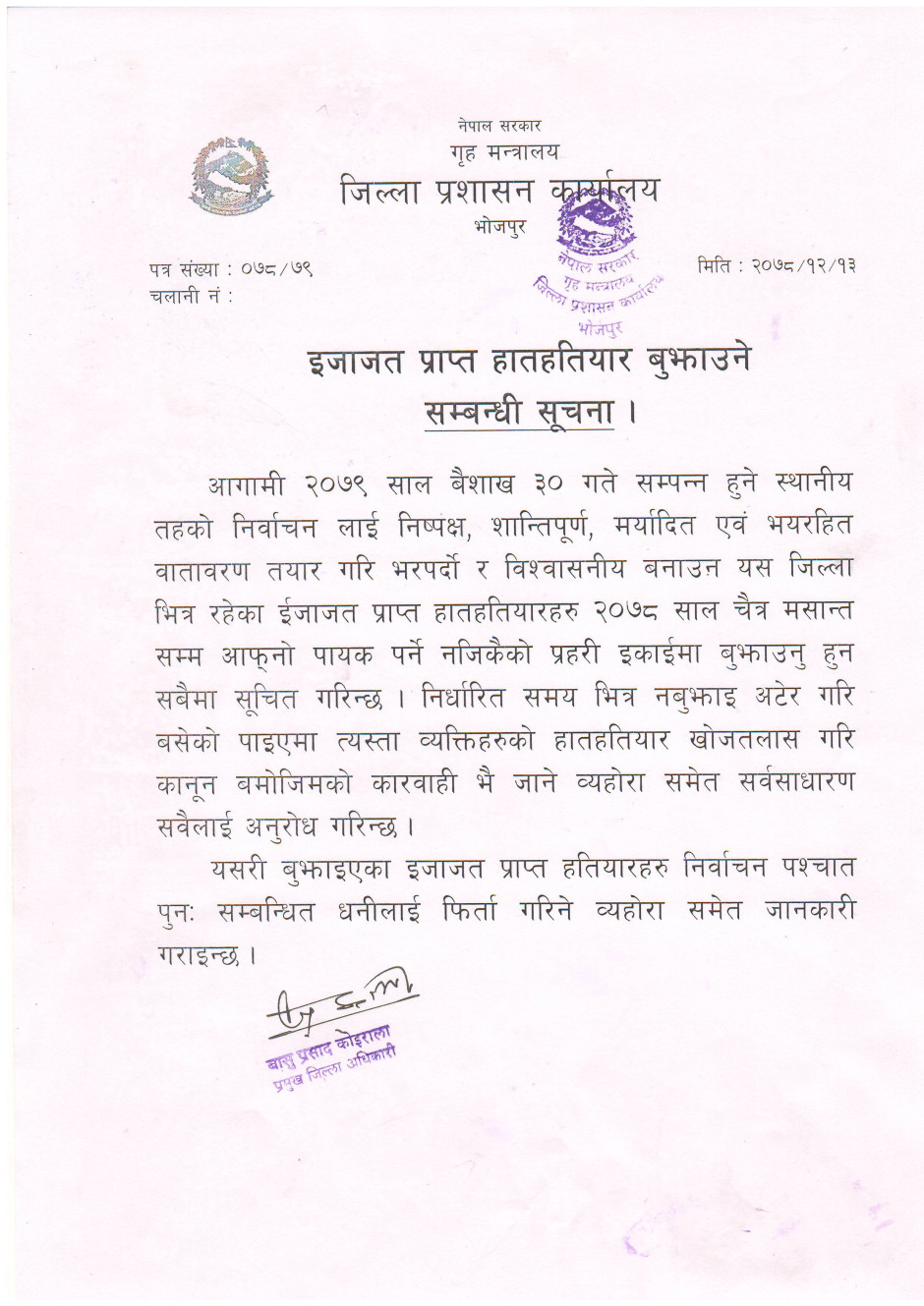 जिल्ला प्रशासन कार्यालय भोजपुरको ईजाजत प्राप्त हतियार बुझाउने दोस्रो पटक प्रकाशित गरिएको सूचना