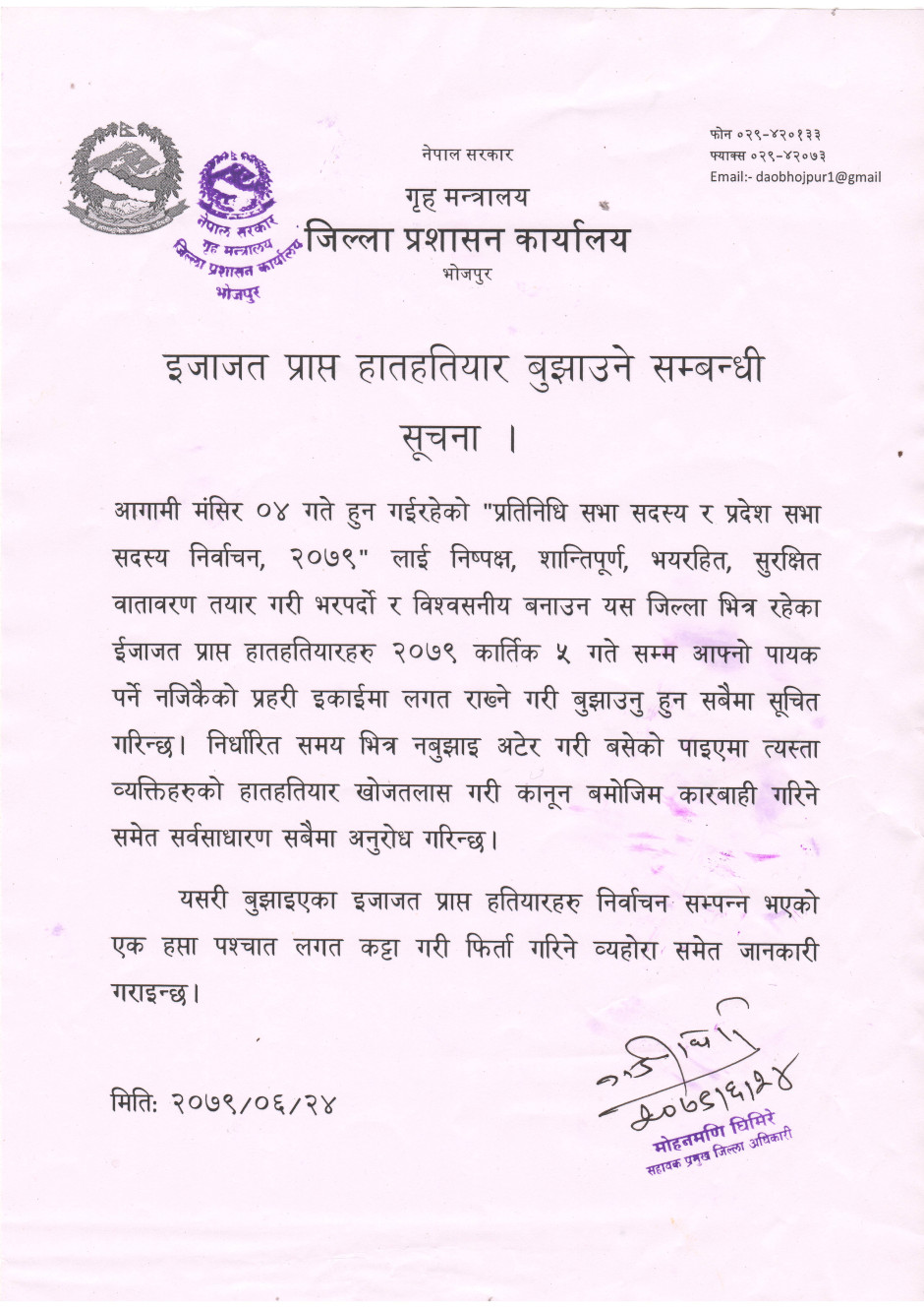 जिल्ला प्रशासन कार्यालय भोजपुरको ईजाजत प्राप्त हतियार बुझाउने दोस्रो पटक प्रकाशित गरिएको सूचना