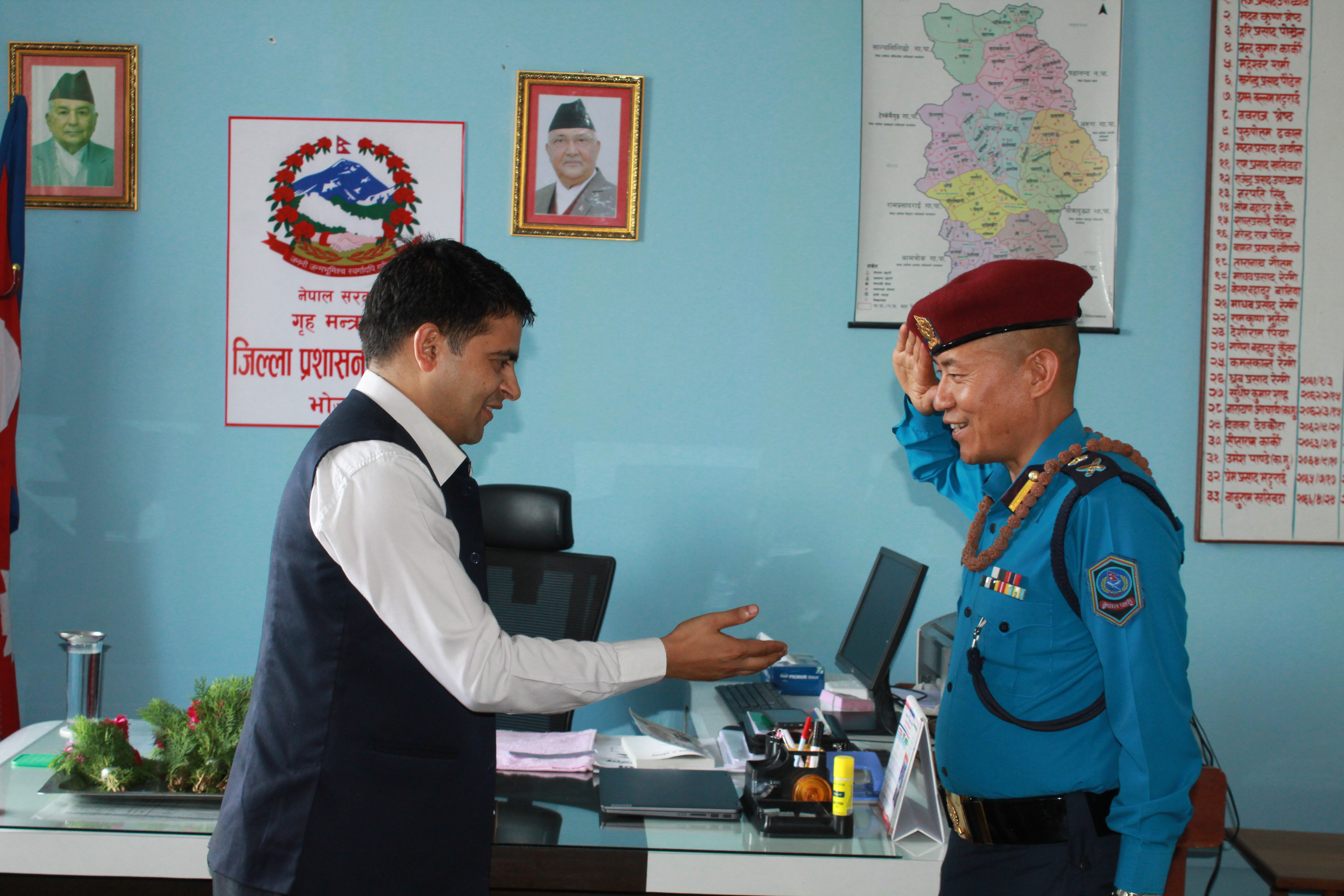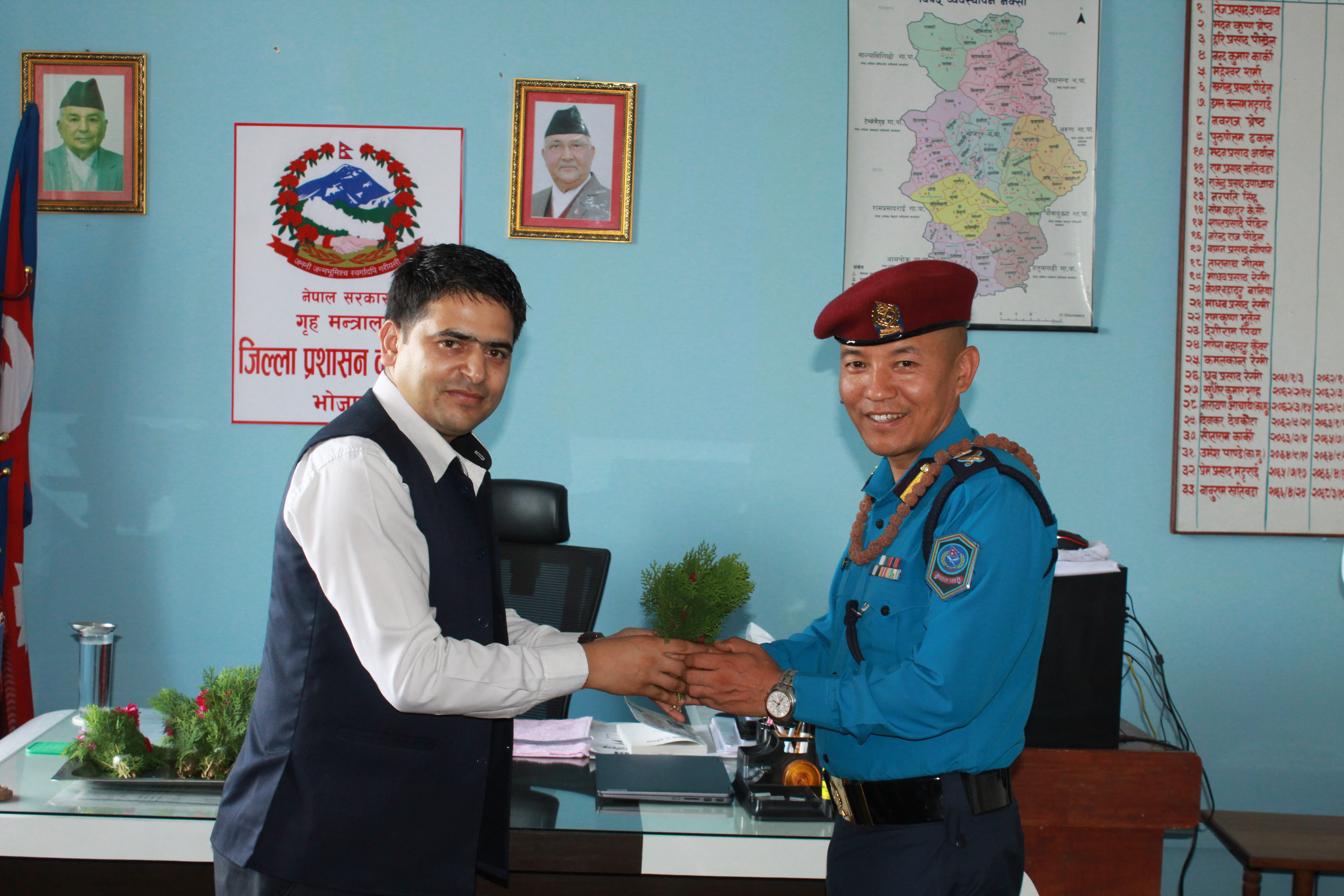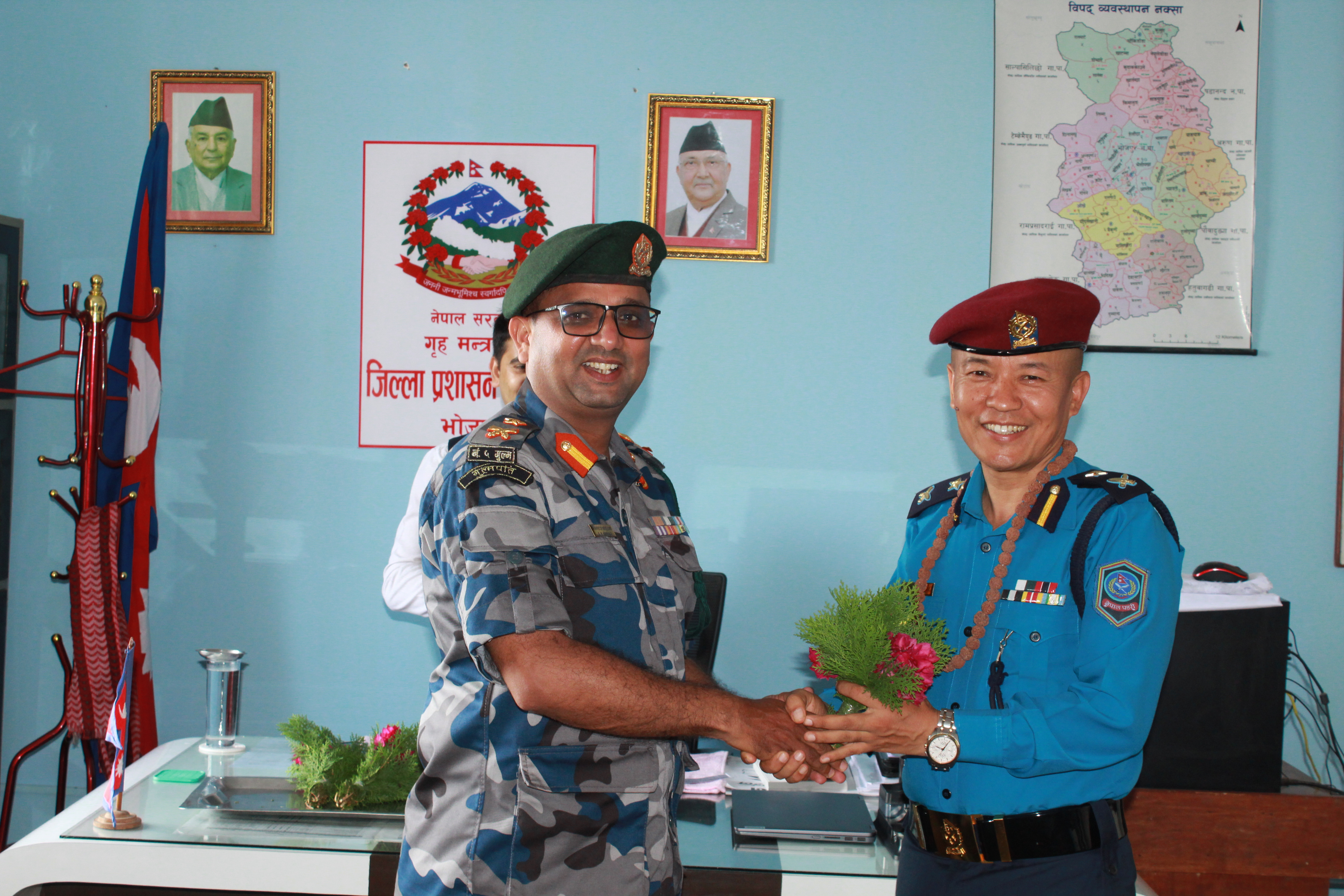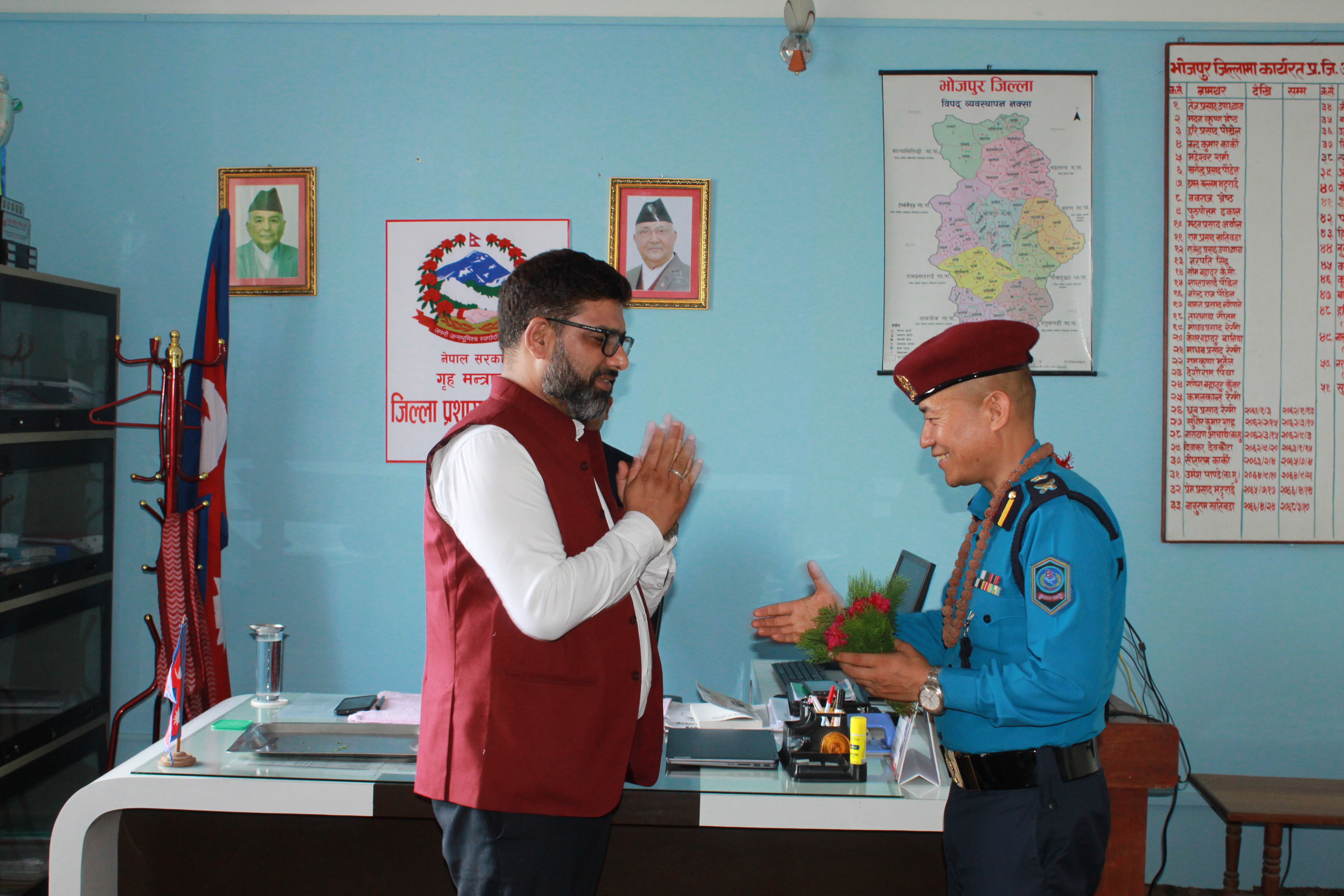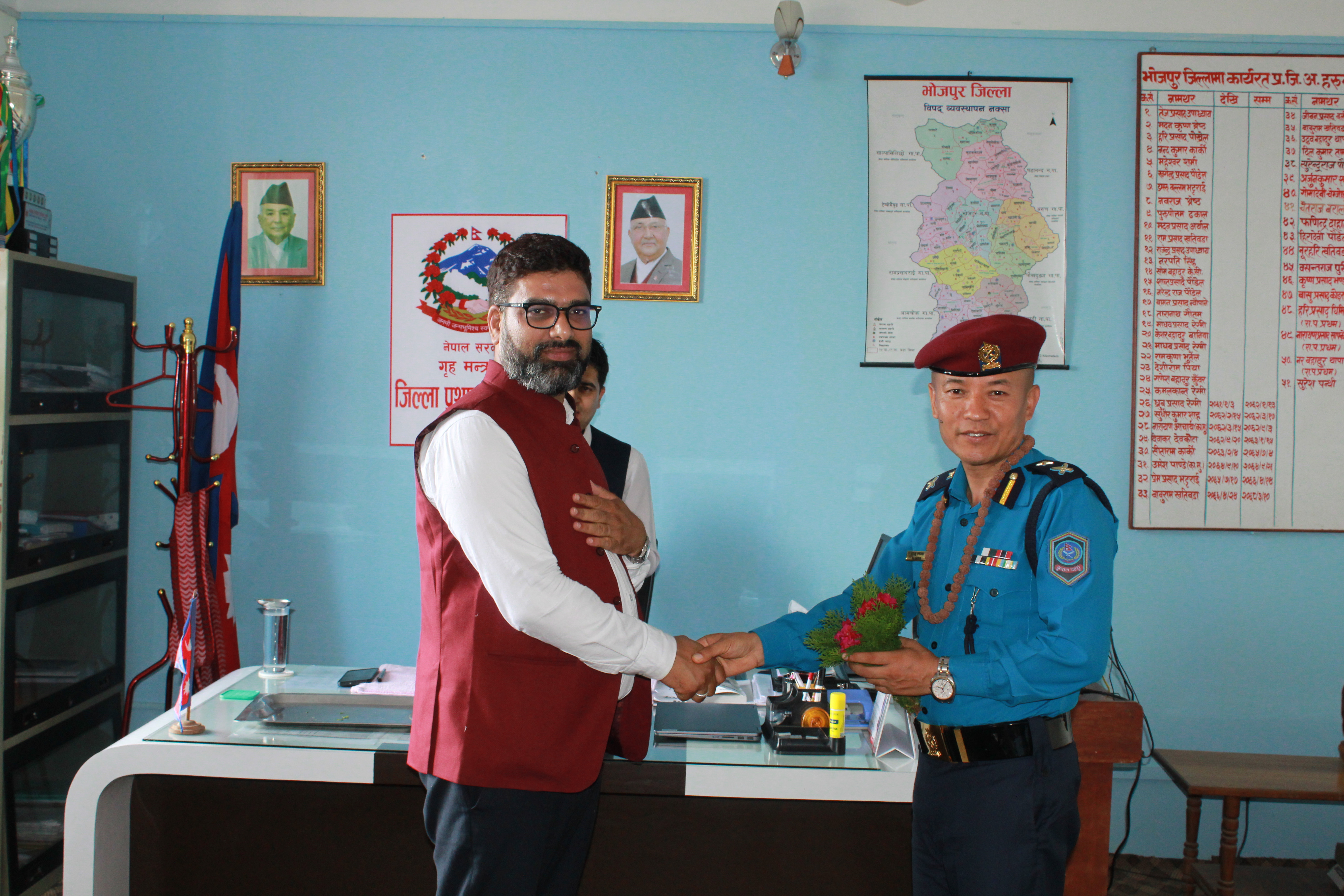 जिल्ला प्रहरी कार्यालय, भोजपुरको कार्यालय प्रमुख रुपमा सरुवा भई आउनु भएका प्रहरी नायब उपरीक्षक श्री राजु लामाज्यूलाई जिल्ला सुरक्षा समितिको तर्फबाट भोजपुरमा हार्दिक स्वागत गर्दै उहाँको सफल कार्यकालको शुभकामना व्यक्त गरियो ।