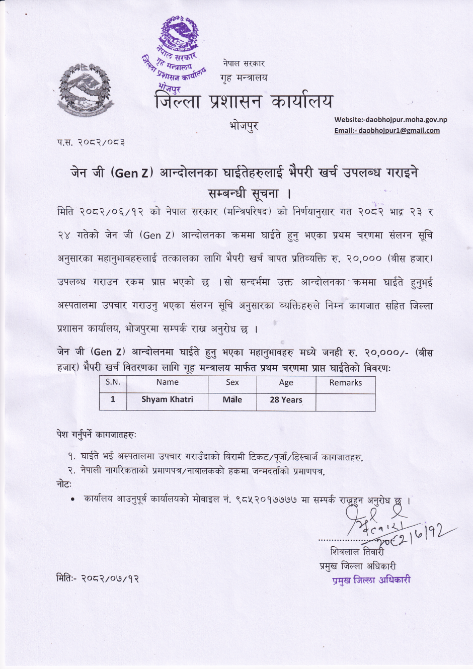 जेन जी आन्दोलनका घाईतेहरुलाई भैपरी खर्च उपलब्ध गराईने सम्बन्धी सूचना