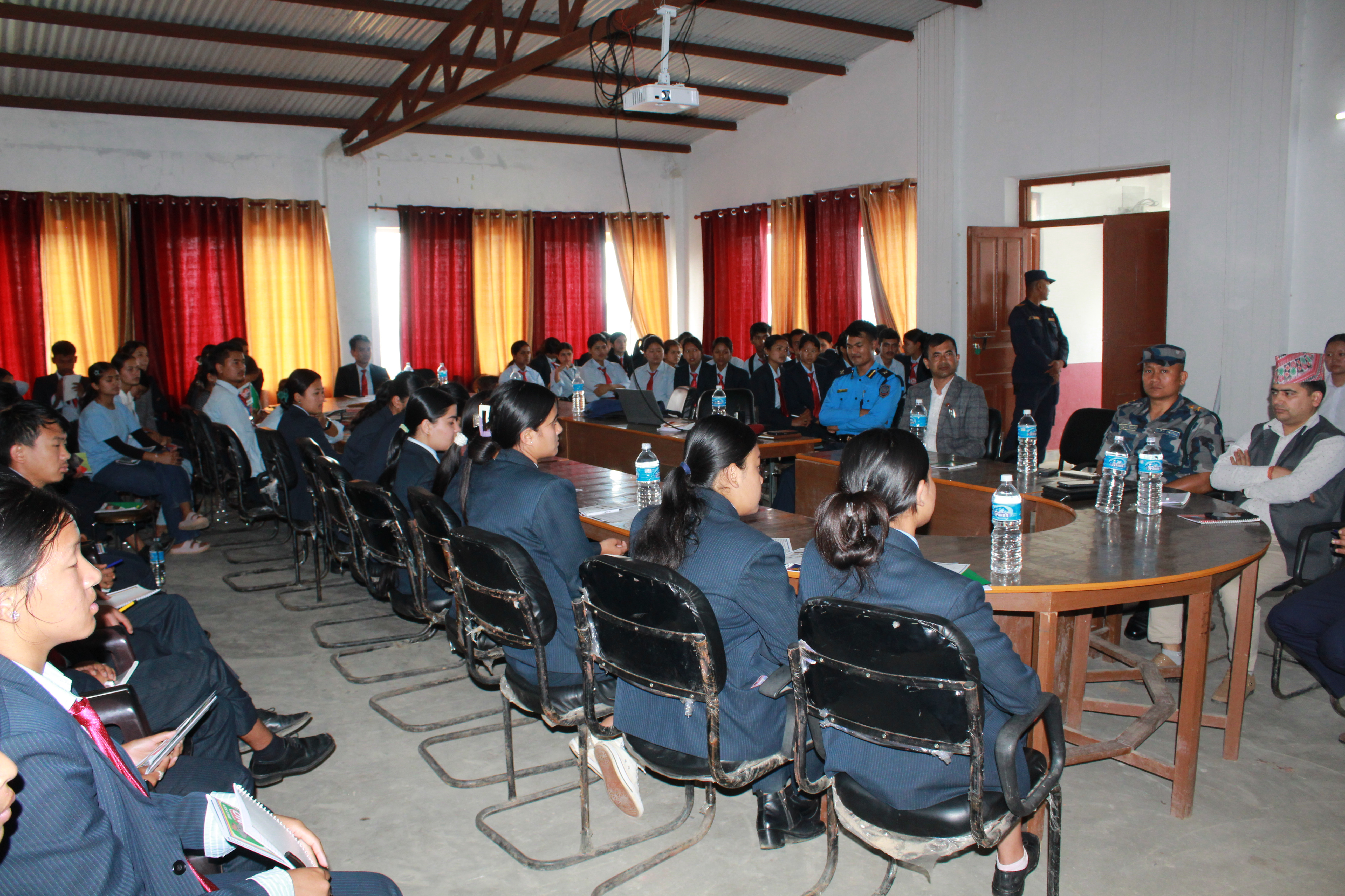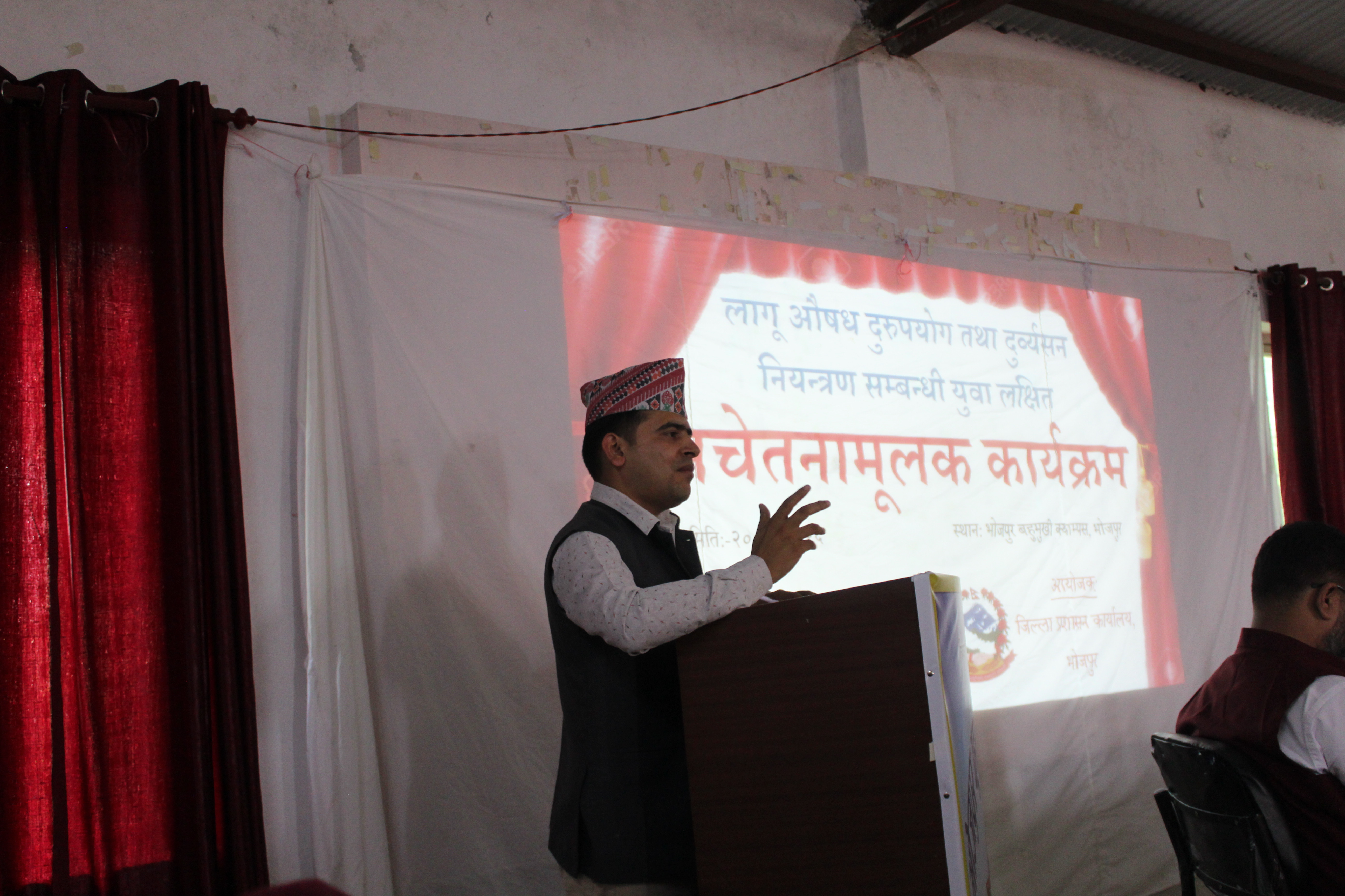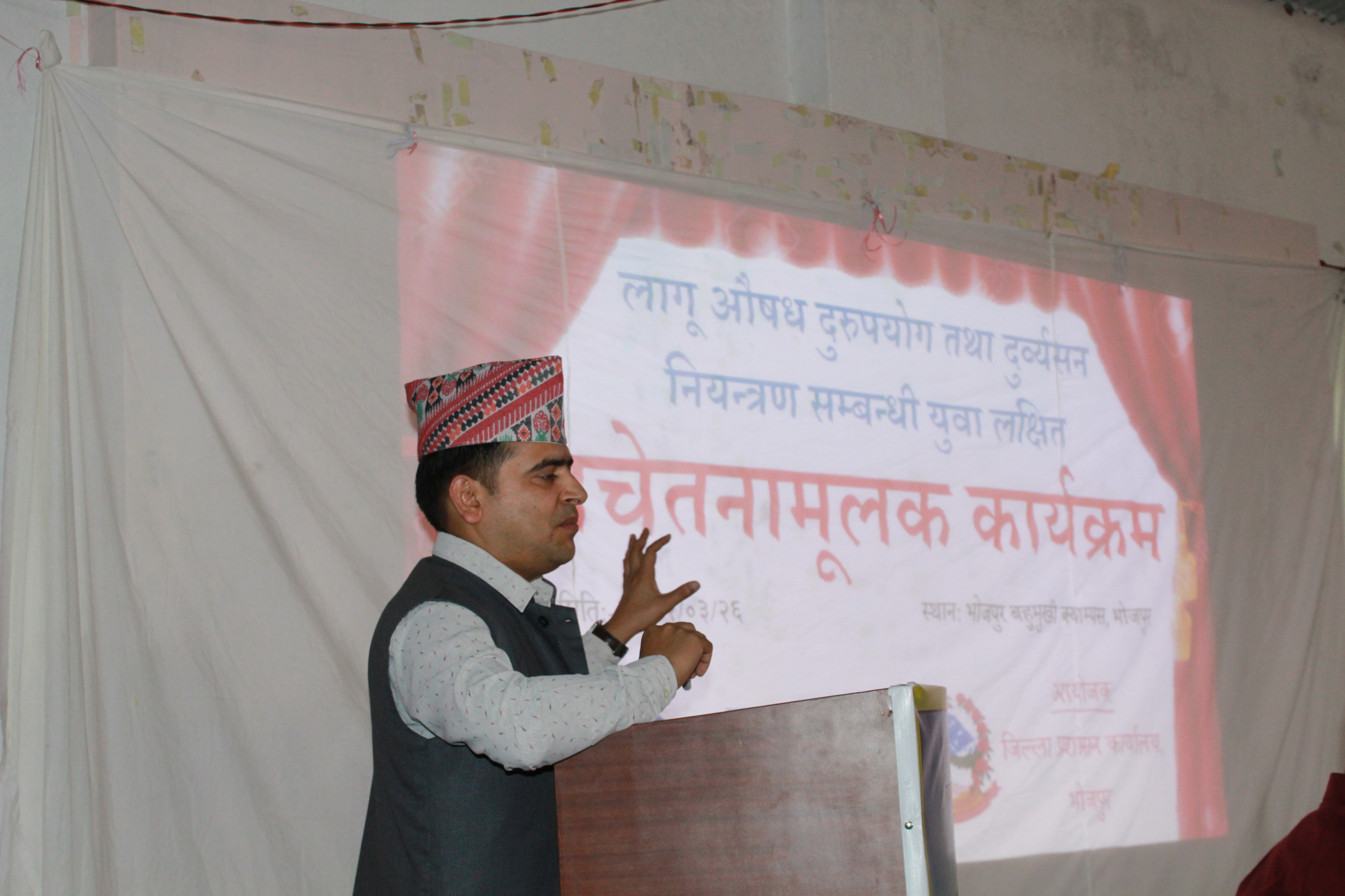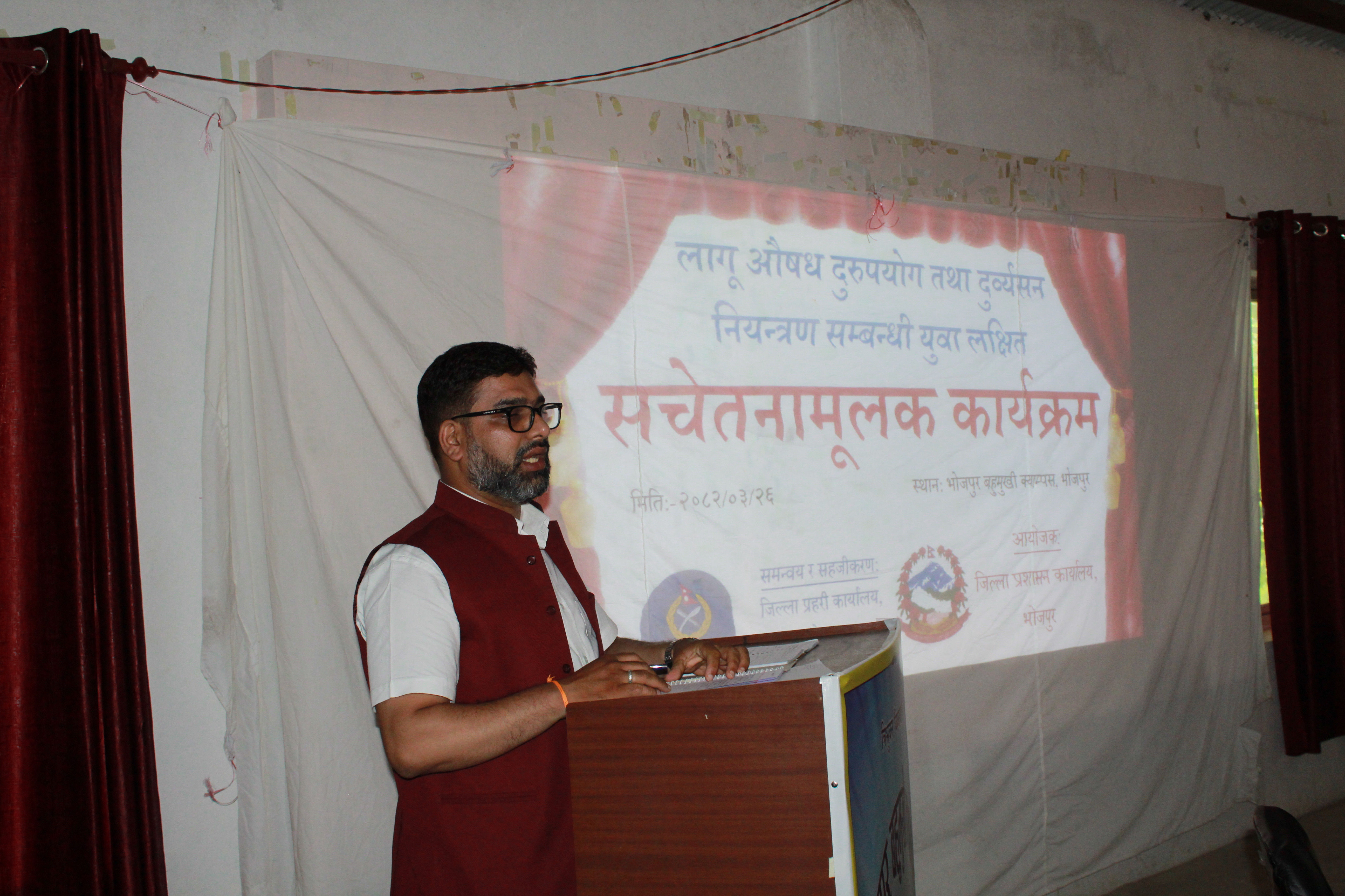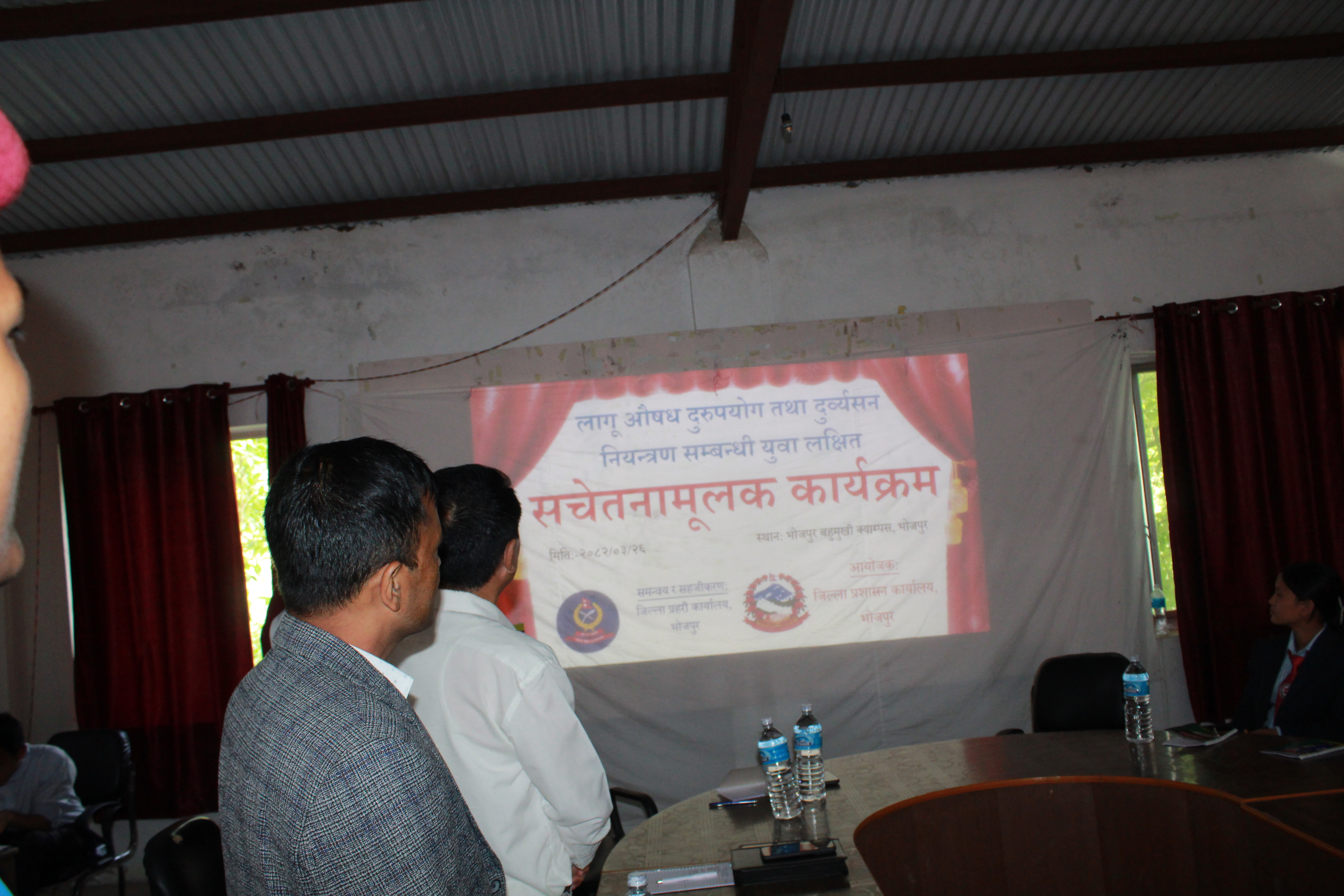 मिति २०८२।०३।२६ गते जिल्ला प्रशासन कार्यालय, भोजपुरको आयोजना, जिल्ला प्रहरी कार्यालय, भोजपुरको समन्वय तथा सहजीकरण एवम् श्रीमान् प्रमुख जिल्ला अधिकारी श्री सुरेश पन्थीज्यूको अध्यक्षतामा लागू औषध दुरुपयोग तथा दुर्व्यसन नियन्त्रण सम्बन्धी युवा लक्षित समेतना