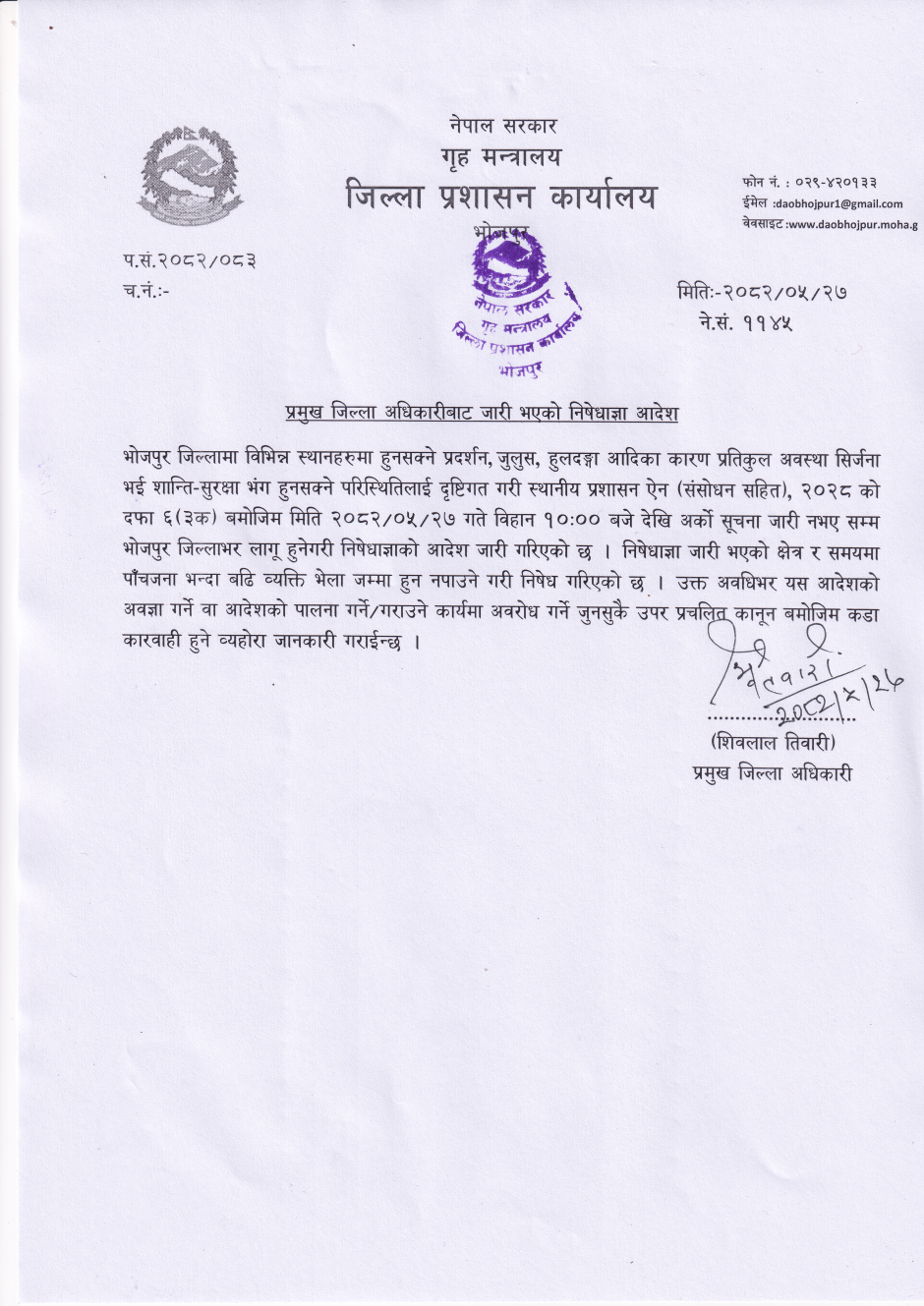 प्रमुख जिल्लाअधिकारीबाट जारी भएको निषेधाज्ञा आदेश